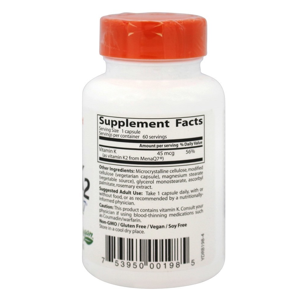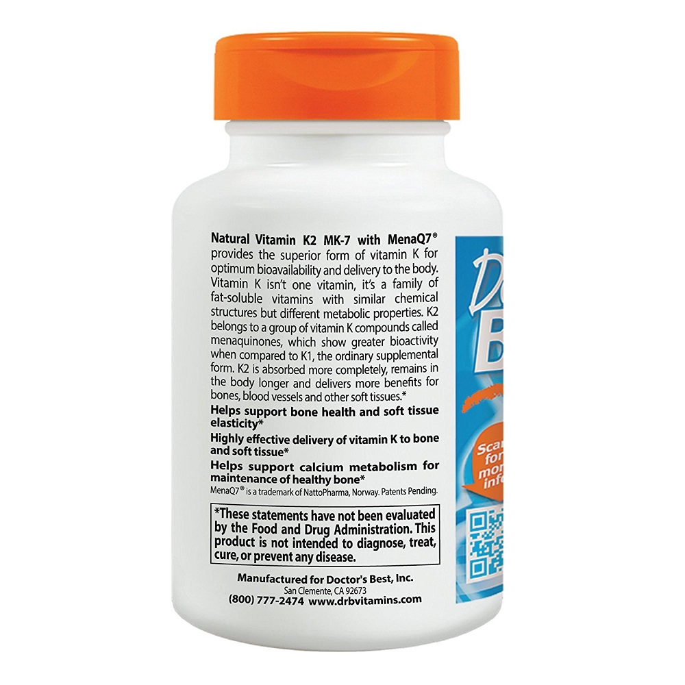 Doctors Best Natural Vitamin K2 MK7 with MenaQ7 contains pure MenaQ7, the superior form of vitamin K for optimum bioavailability and delivery to the body. MenaQ7 is purified from fermented chickpeas which are naturally rich in vitamin K2. Not just a single vitamin, Vitamin K is a family of fat-soluble vitamins with similar structures, but different metabolic properties. Vitamin K2 belongs to the group of vitamin K compounds called “menaquinones” which demonstrate greater bioactivity when compared to vitamin K1 (the ordinary form of supplemental vitamin K). Vitamin K2 is absorbed more completely, remains in the body longer and delivers more benefits for bones, blood vessels and other soft tissues.